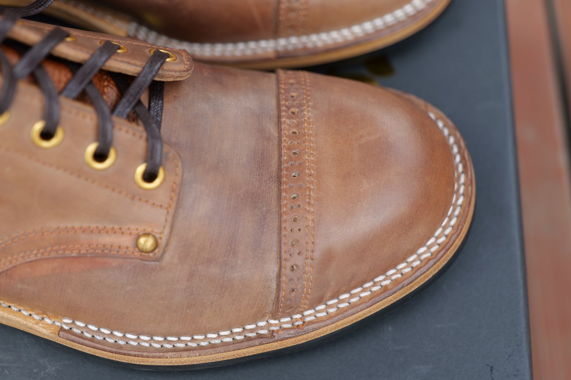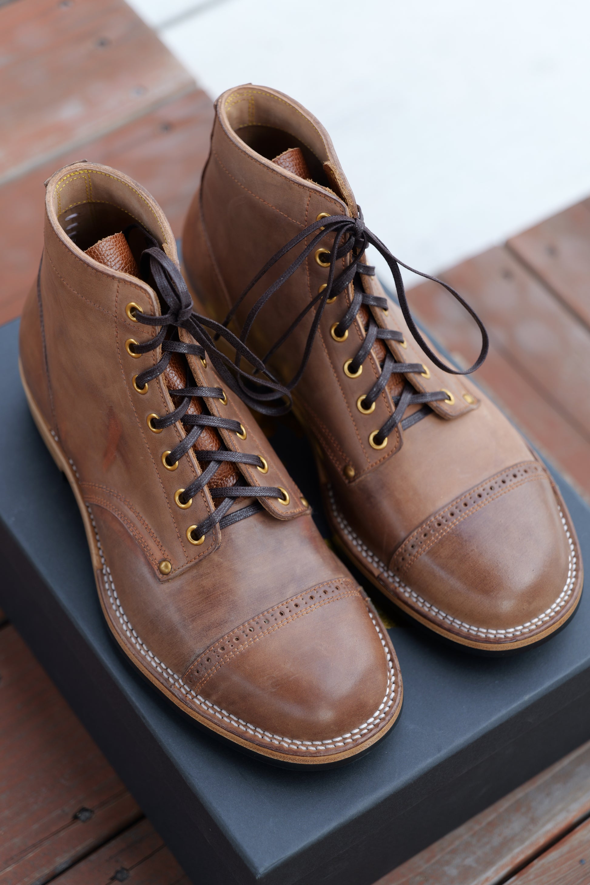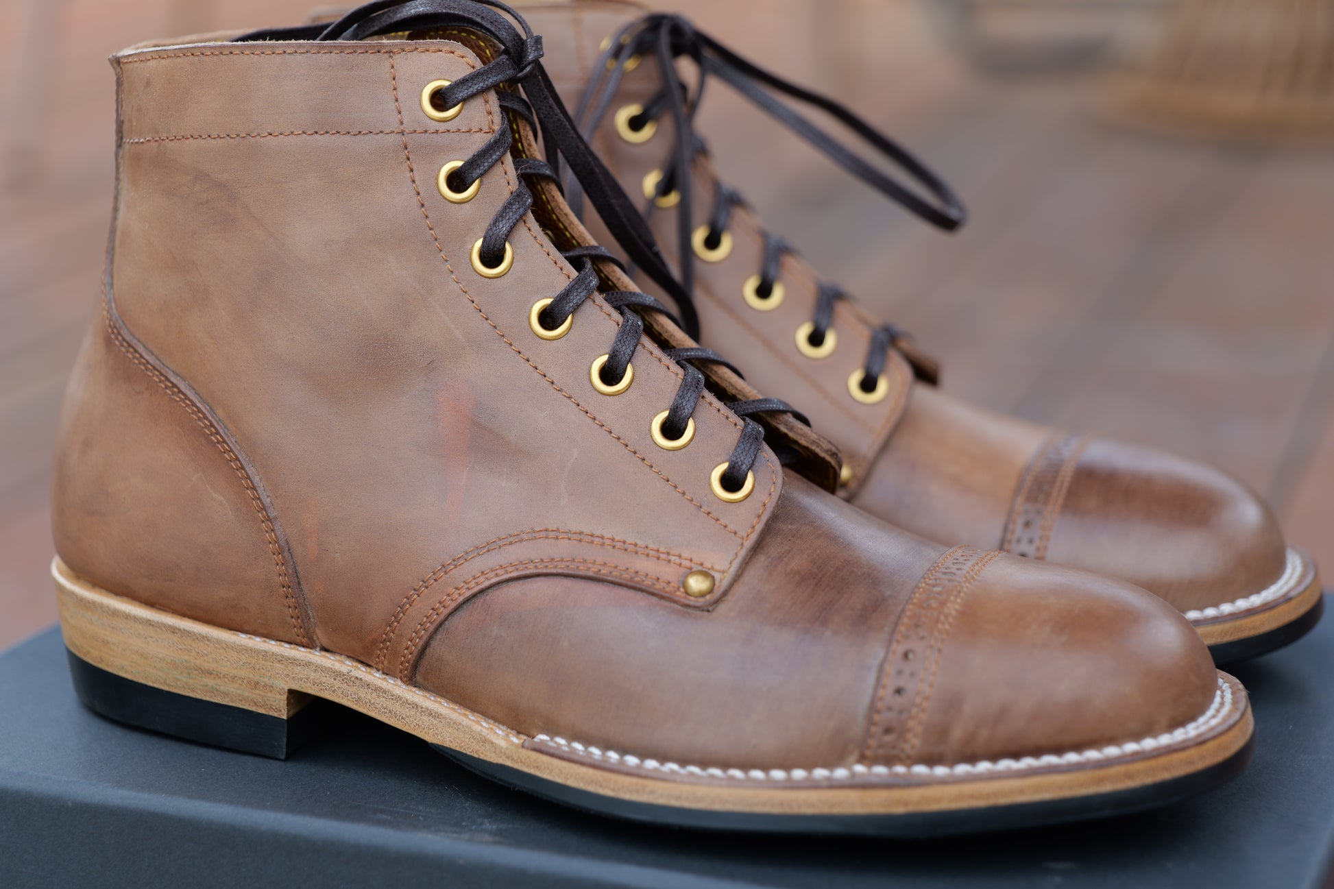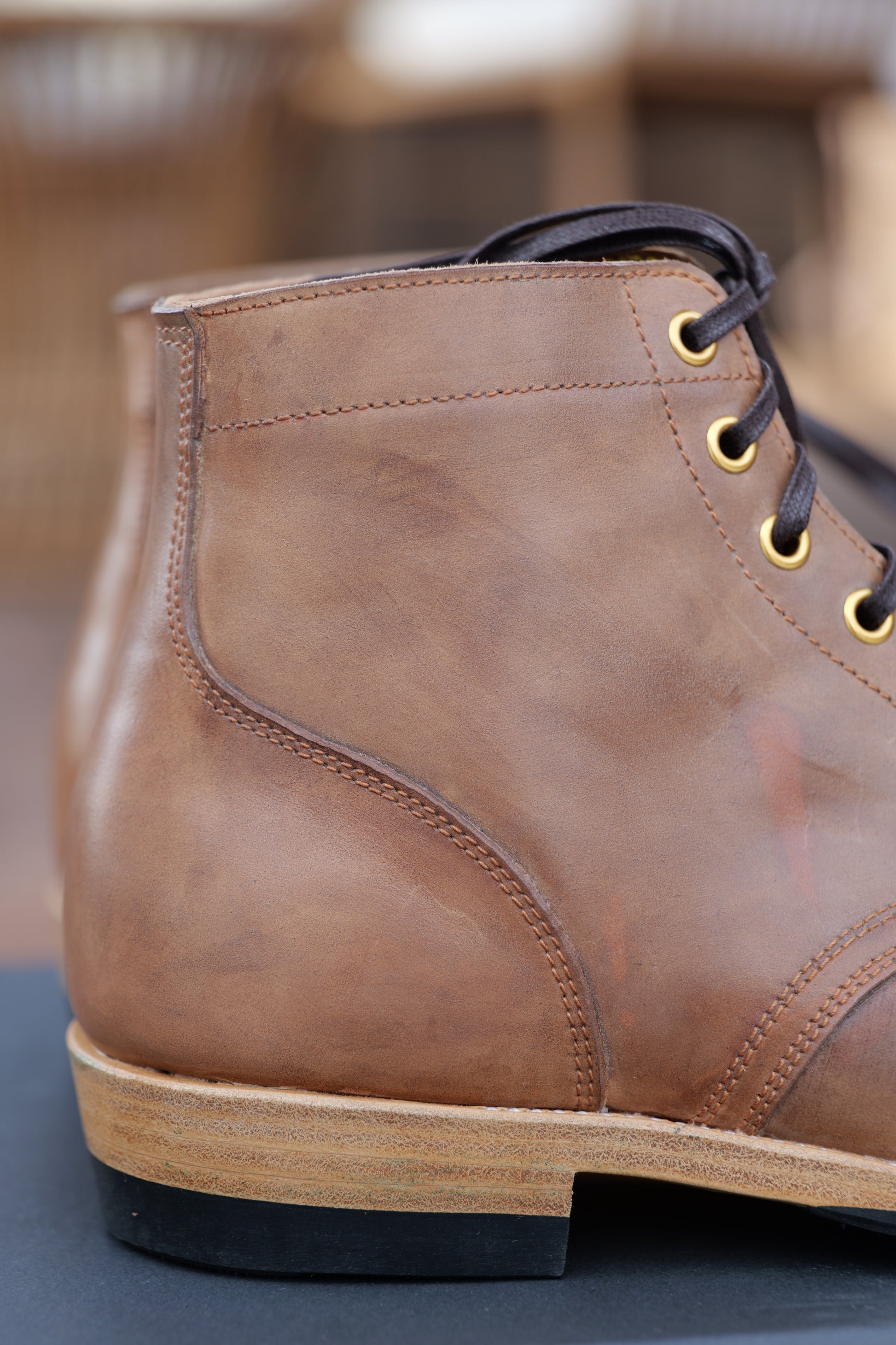 2. For hand dyed / hand patinated leather, slight color difference among pairs, or inconsistent coloring (like some parts could be darker and some parts could be lighter) on the same pair could happen. It's the nature of hand dye / hand patina