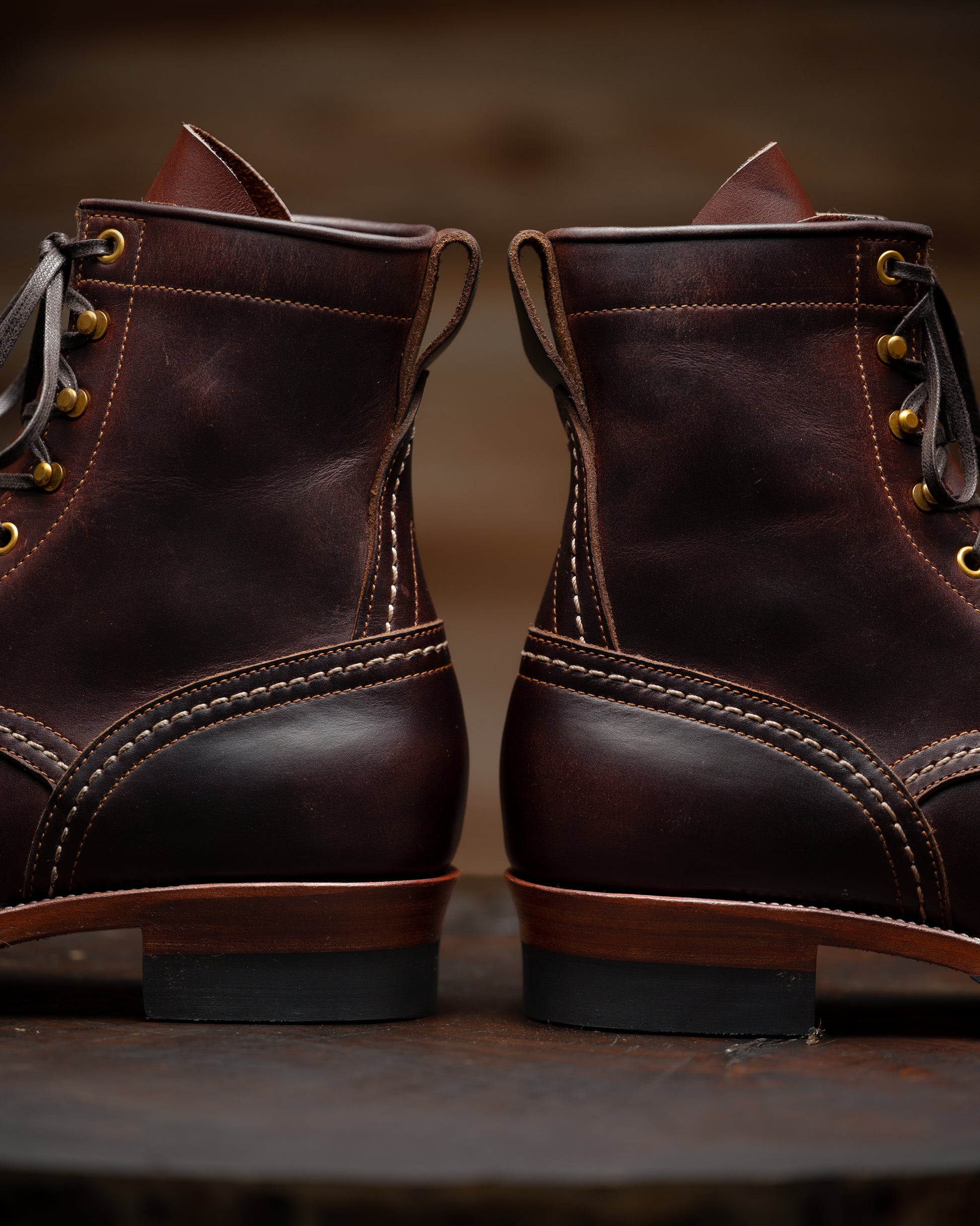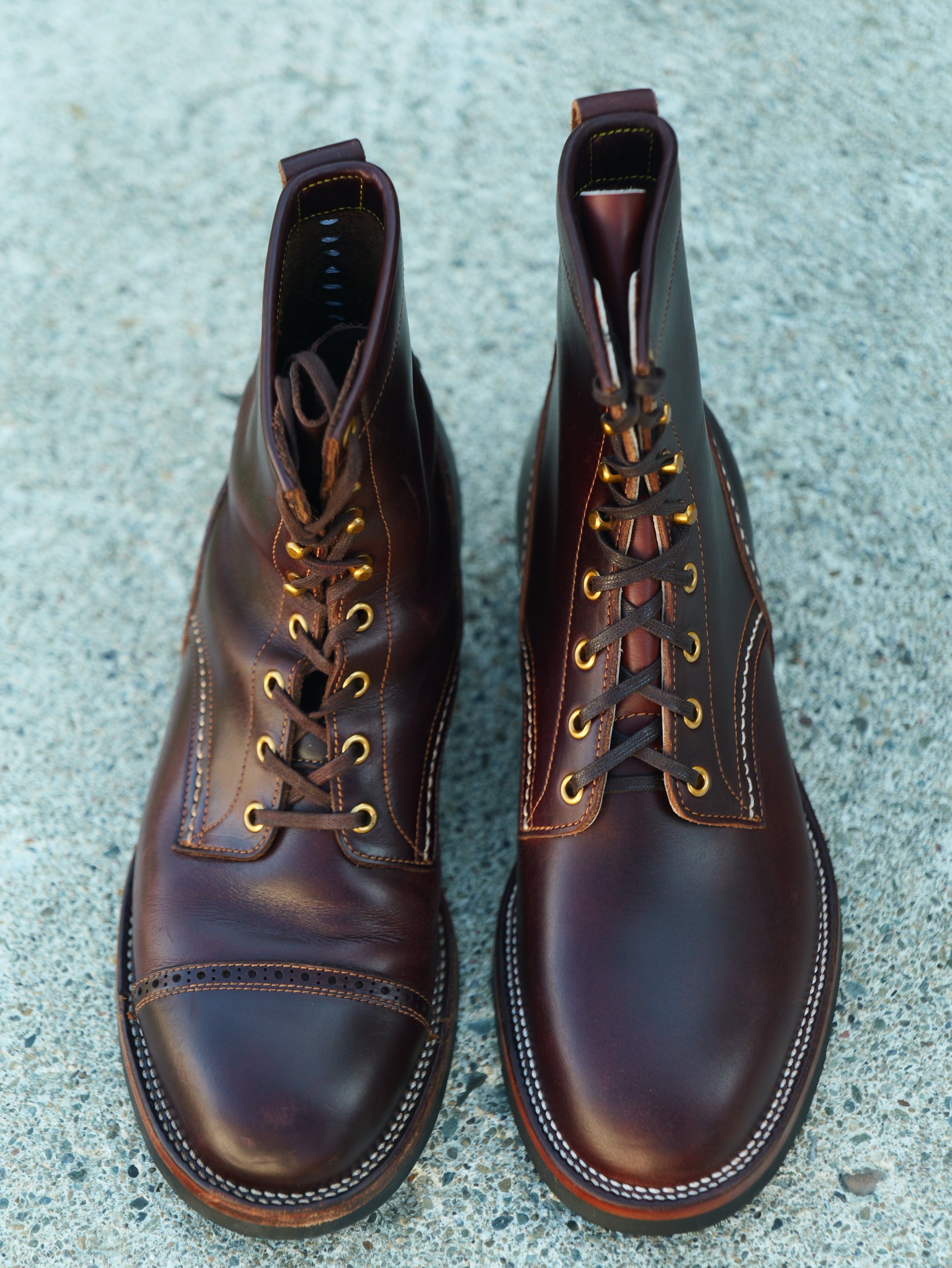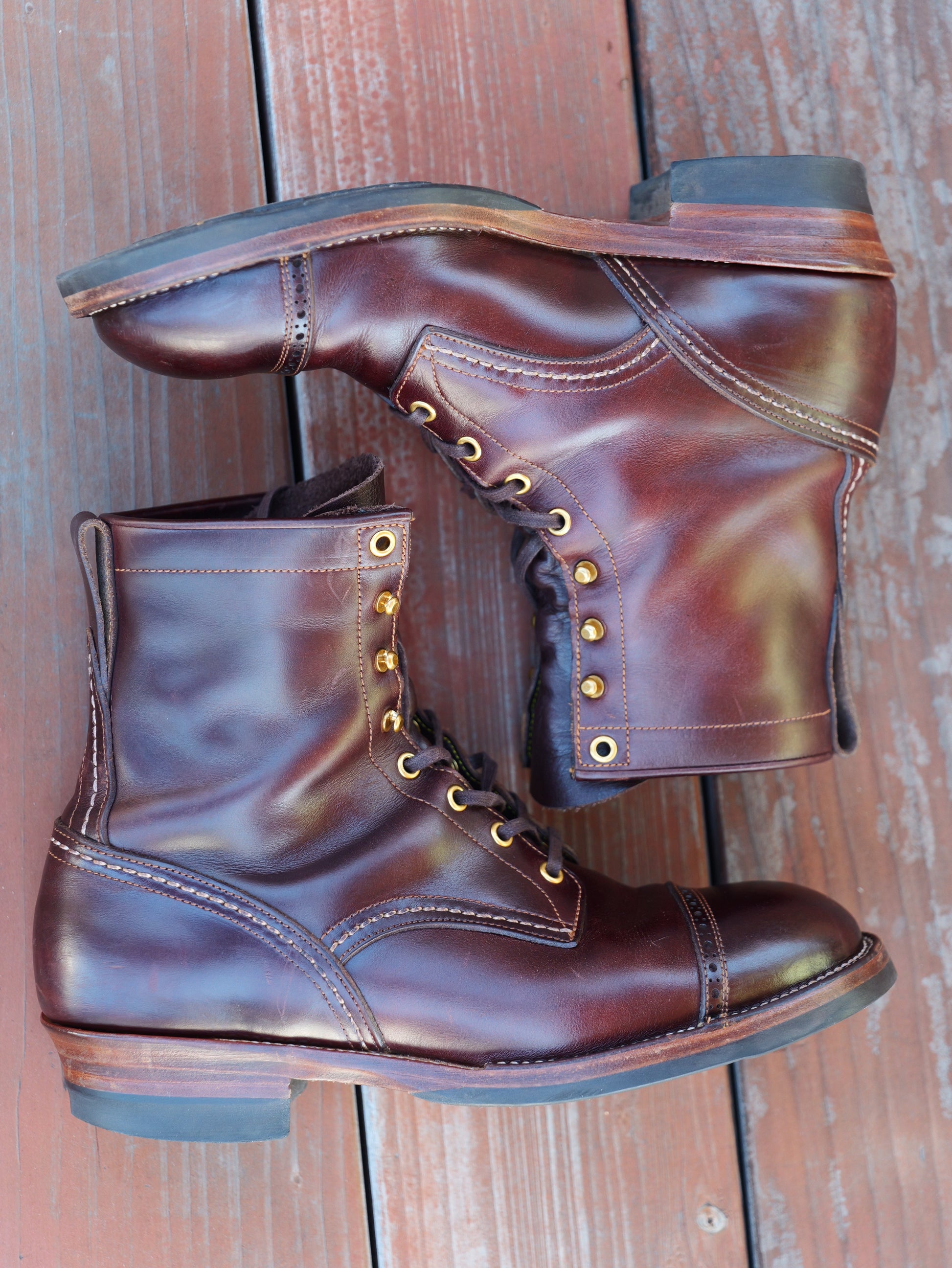 2. For hand dyed / hand patinated leather, slight color difference among pairs, or inconsistent coloring (like some parts could be darker and some parts could be lighter) on the same pair could happen. It's the nature of hand dye / hand patina